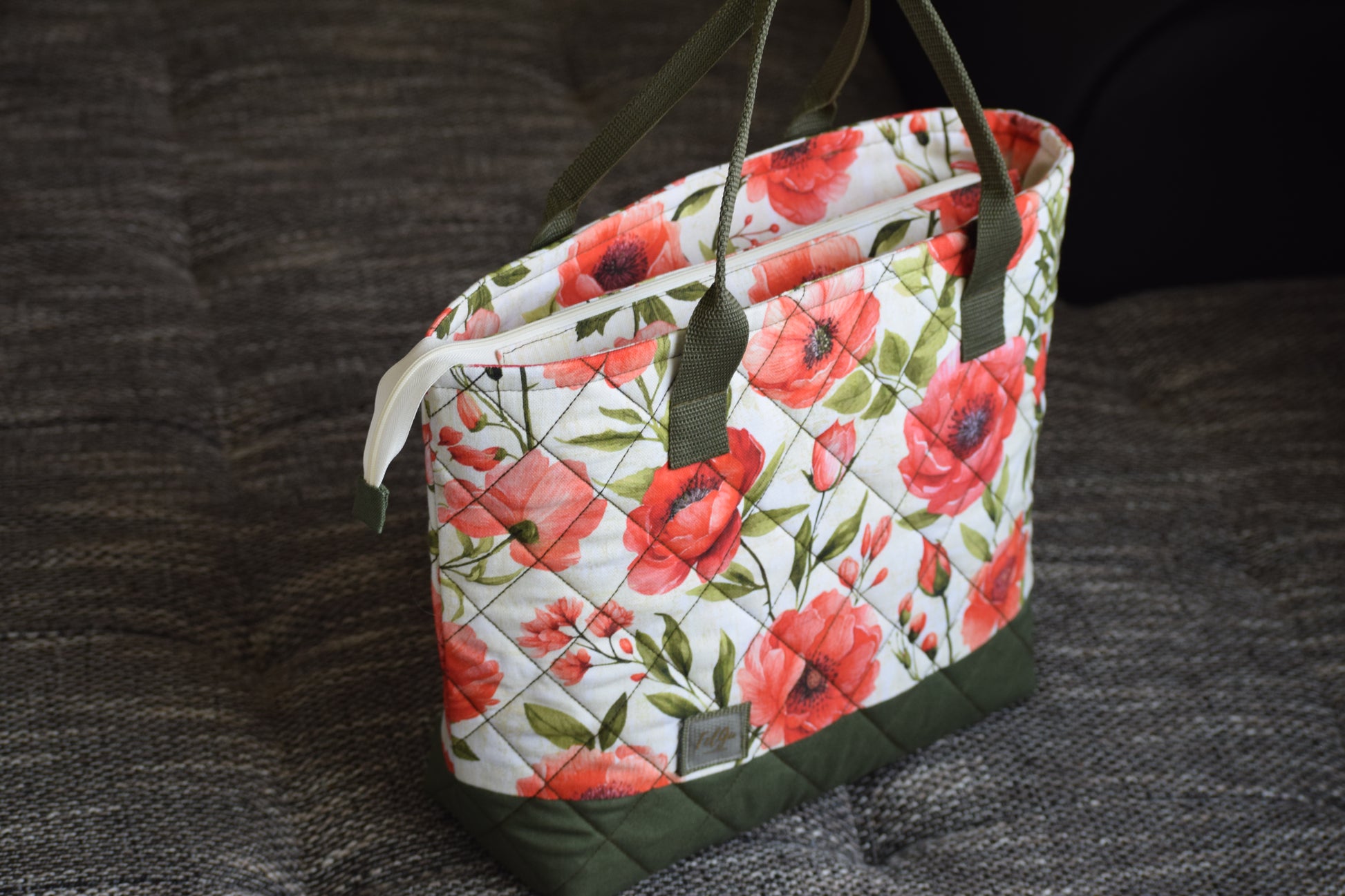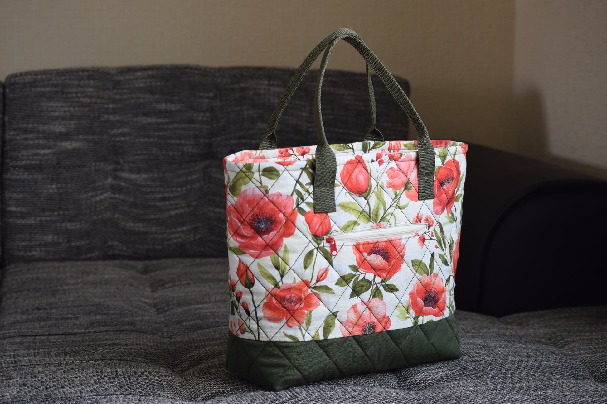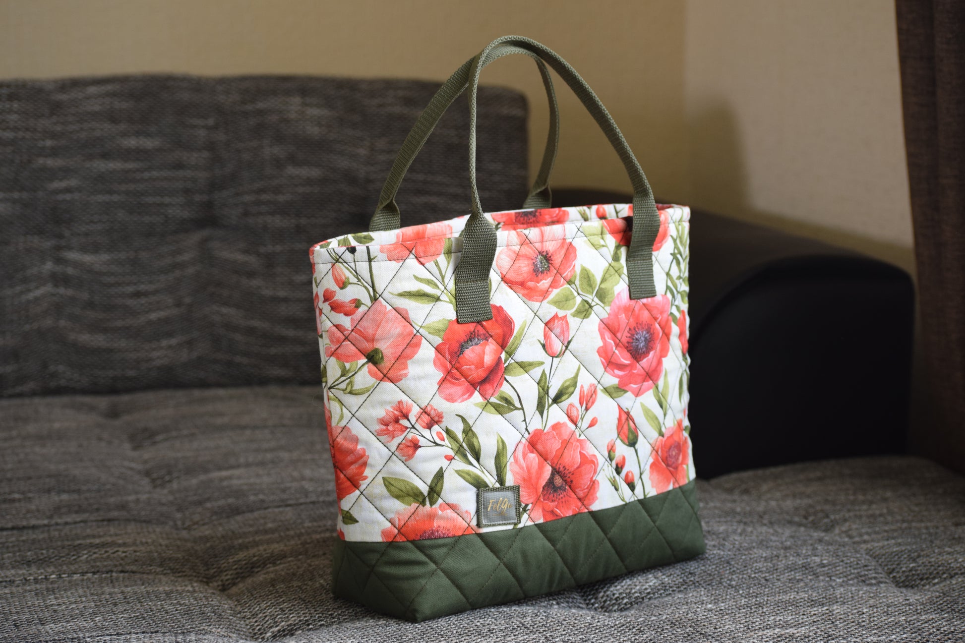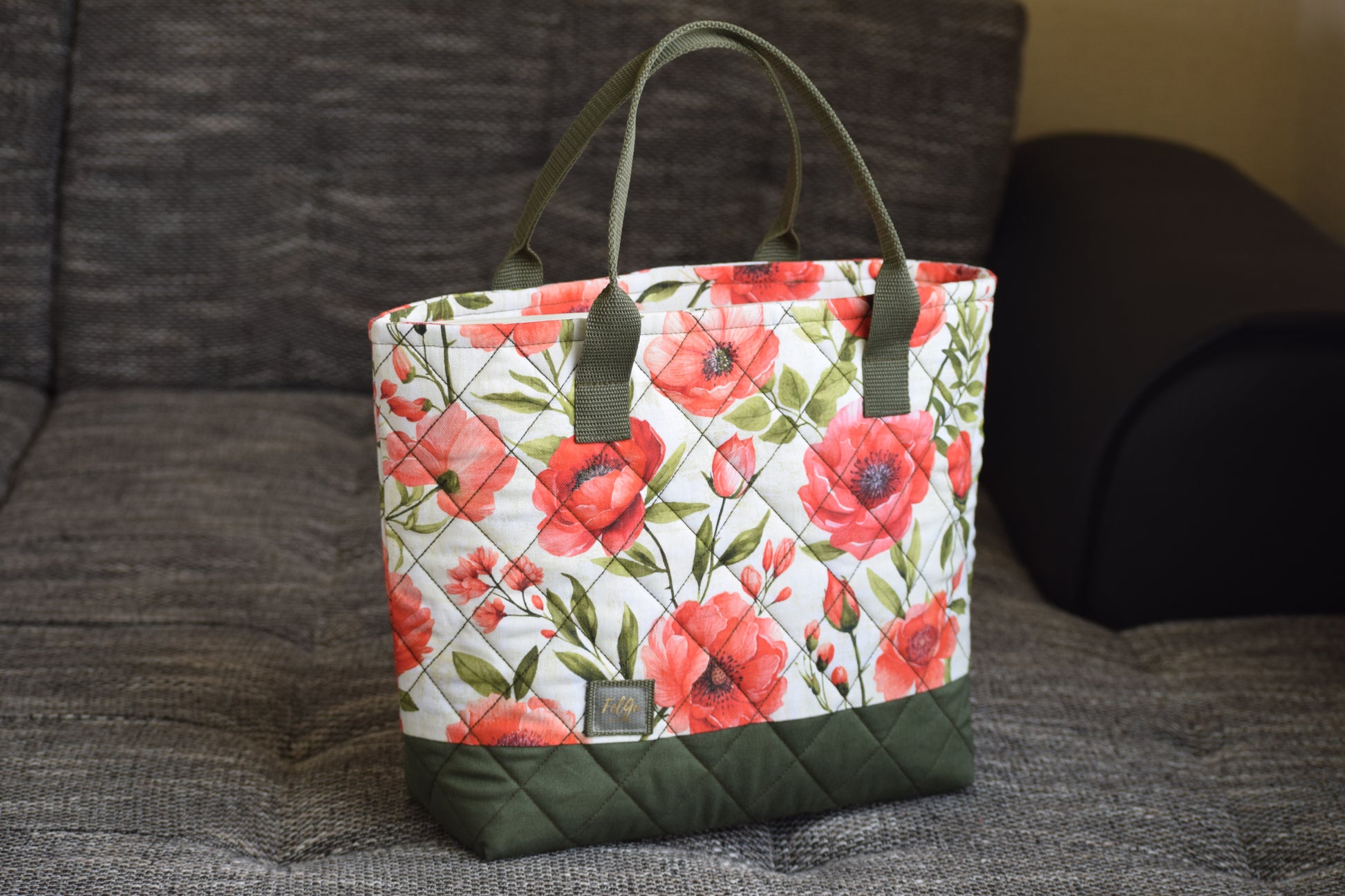 Vasarīga šopersoma no kokvilnas kanvas auduma ar magoņu apdruku. Manuāli stepēta somas saturīgumam un formai. Ļoti viegla, ērta un gana ietilpīga. Iekšpusē divas atvērta tipa kabatas, ārpusē viena ar rāvējslēdzēju. Somas aizdare ar rāvējslēdzēju.